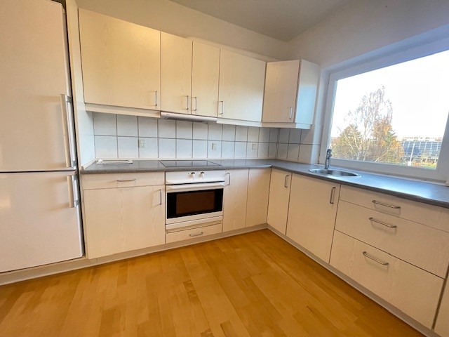 Lejligheden består af en entre og lige fordelingsgang. Stor stue med udgang til stor balkon, og udsigt over grønne områder. Pænt klassisk køkken med meget skabsplads, alle hvidevare også opvaskemaskine. I køkkenet er der også fin plads til bord med 4 stole. Stort soveværelse samt 2 næsten ens ekstra værelser med skabe. Pænt lyst enkelt badeværelse med spots i loftet. Ejendommen har fjernvarme. Dørtelefon. Lejligheden ligger skønt ugeneret på 2. etage. Også meget tæt på gode indkøbsmuligheder i gåafstand.